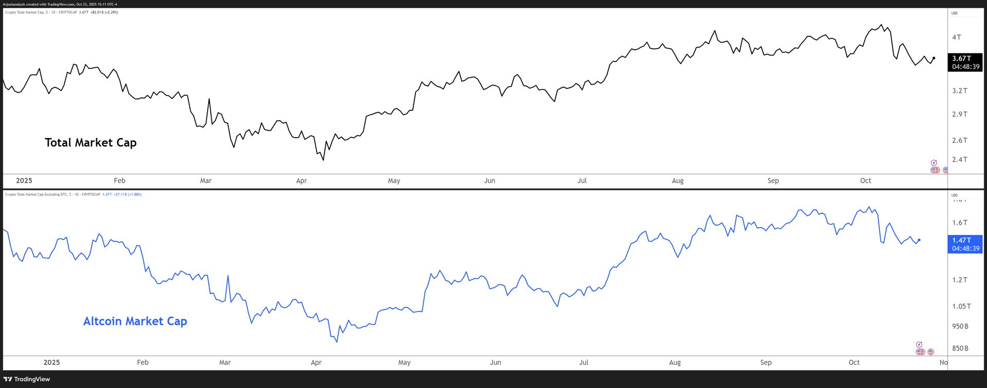 And here’s a look at crypto’s total market and altcoin market cap charts: