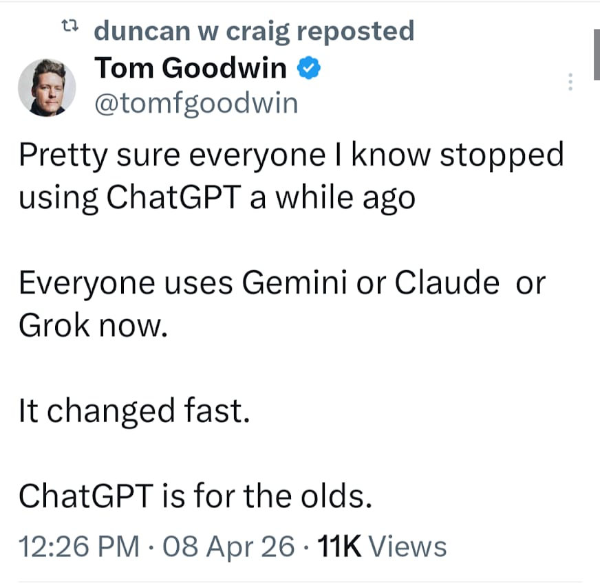 CLAUDE FOR THE WIN: This is broadly the consensus among everyone in tech that I speak with. The really remarkable thing Tom hits on is JUST HOW FAST it changed from OpenAI dominating the landscape. Life comes at you quickly.