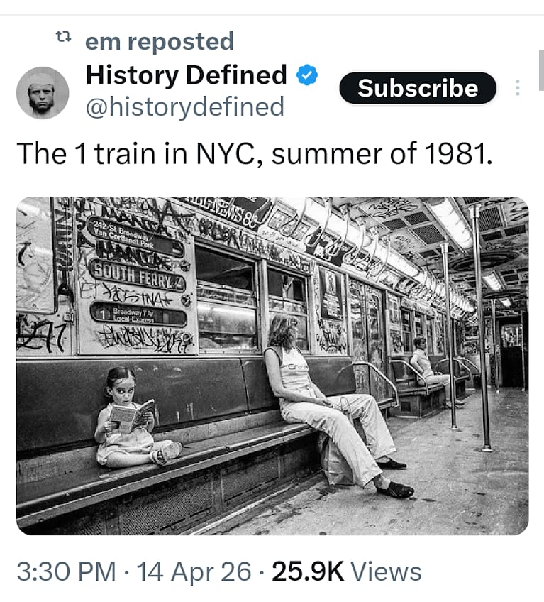 THE 1 TRAIN: I never get tired of looking at old photos of New York in the 1980s to remind me about how much things have changed.