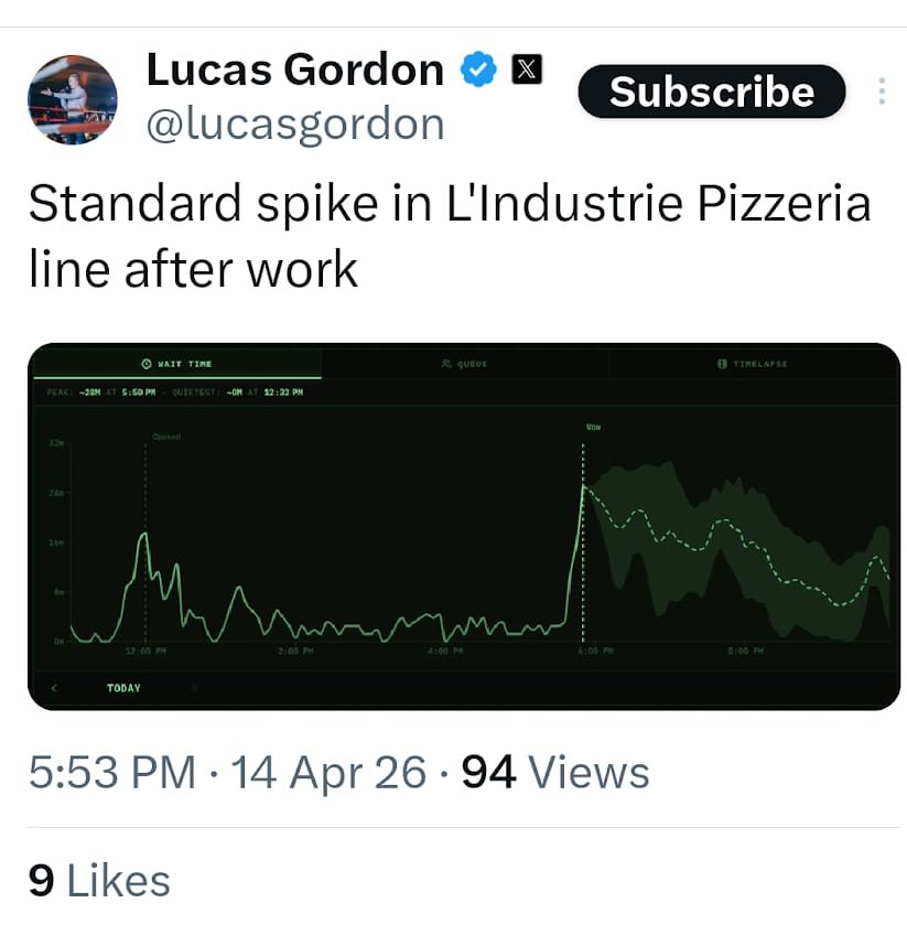 THE LINE AT L’INDUSTRIE: Lucas Gordon is an engineer at X (Twitter). He paid people who live across the street from hot downtown food places like L’Industrie Pizzeria to set up cameras to monitor the lines and then used AI image detection to calculate how long the line is at any point. So many cool things going on in tech.