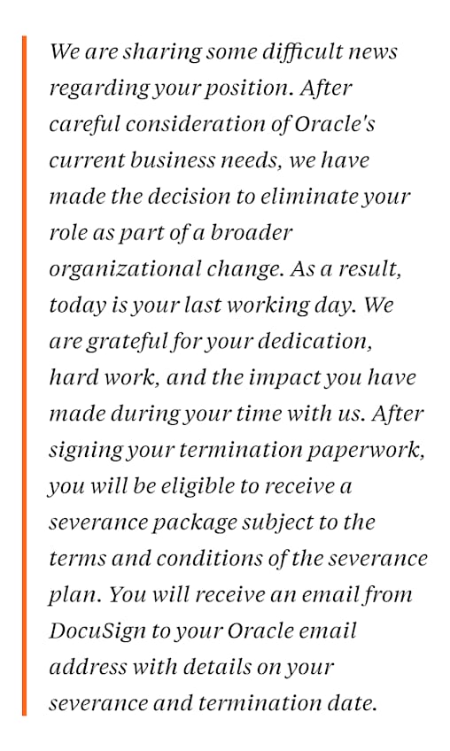 ORACLE LAYOFFS: This is the actual email Oracle sent to 30,000 people to let them go. It’s hard to imagine that as more and more people have this experience there won’t be some kind of fallout – whether its political or cultural or social. If this hasn’t happened to you, you may not understand. If it has, you do.