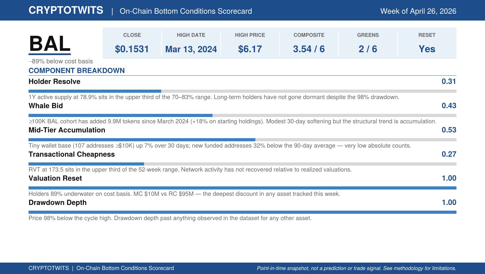 The Read: Participation base is genuinely tiny: 107 wallets hold ≥$10K USD worth of BAL globally. Volume hasn’t recovered, holders haven’t gone dormant, and the addressable on-chain audience is small enough that any signal here should be read with that context in mind.