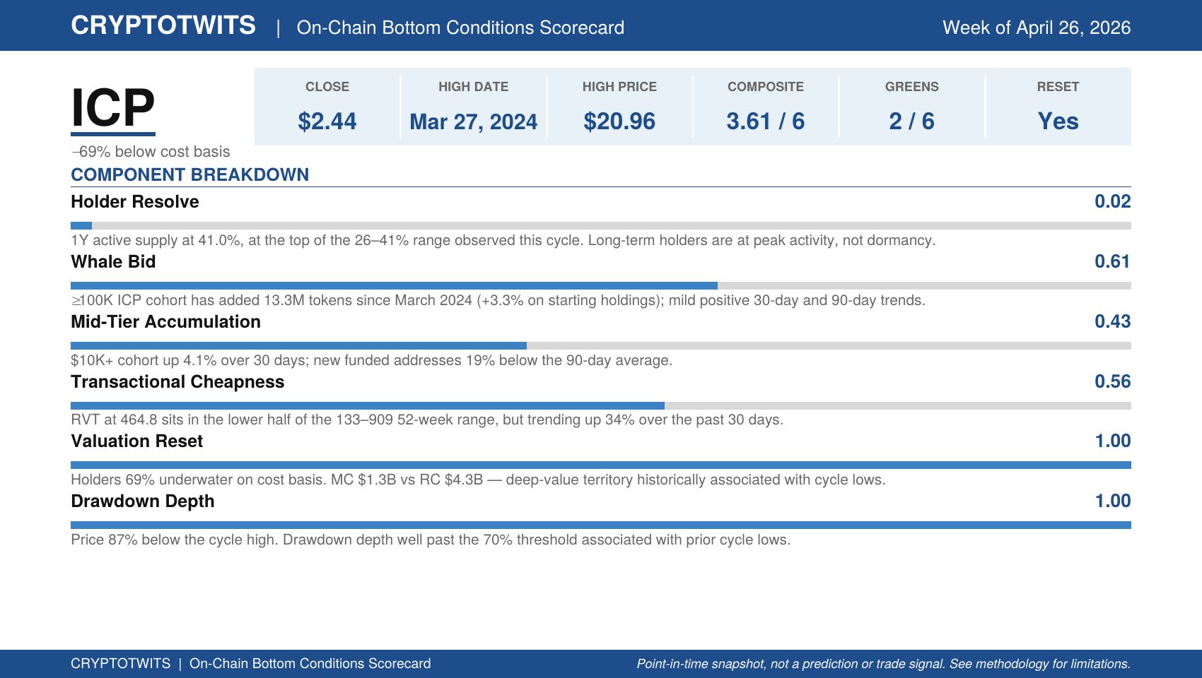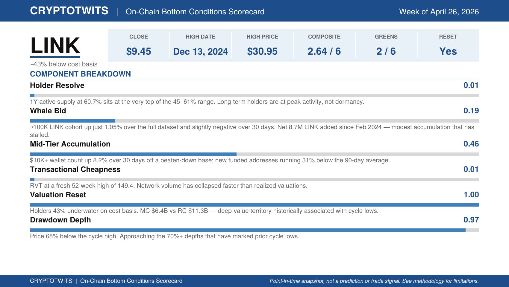The On-Chain Bottom Conditions Scorecard grades an asset across six conditions – cost-basis discount, drawdown depth, whale accumulation, retail participation, network volume dynamics, and long-term holder dormancy – and produces a 0-to-6 composite score.