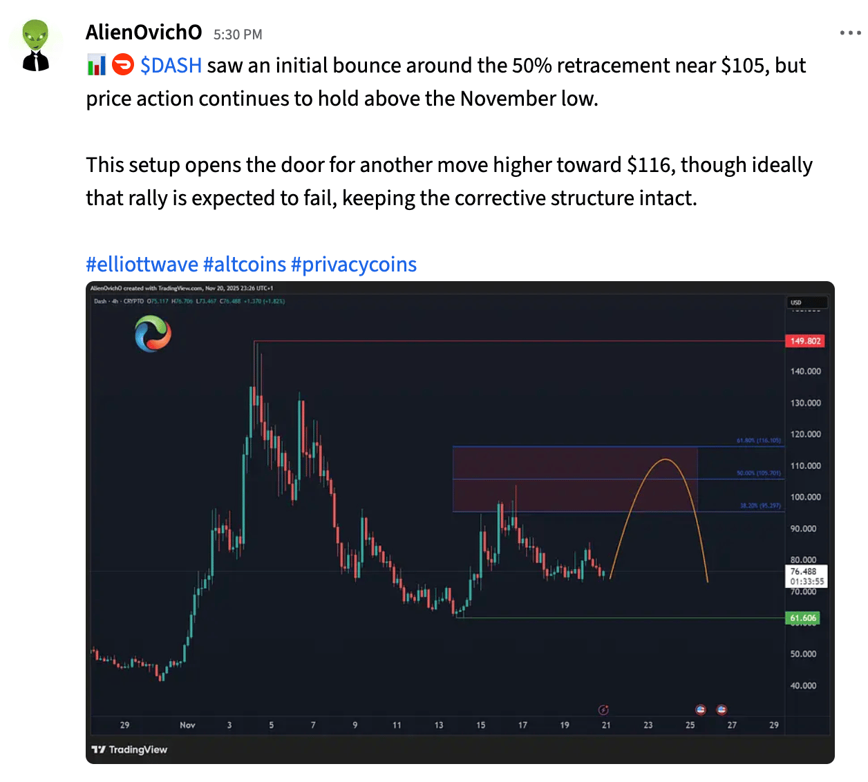 DASH Holds Above November Low As 50% Fib Bounce Eyes $116, But Elliott Wave Flags Rally Failure Risk 🌀
