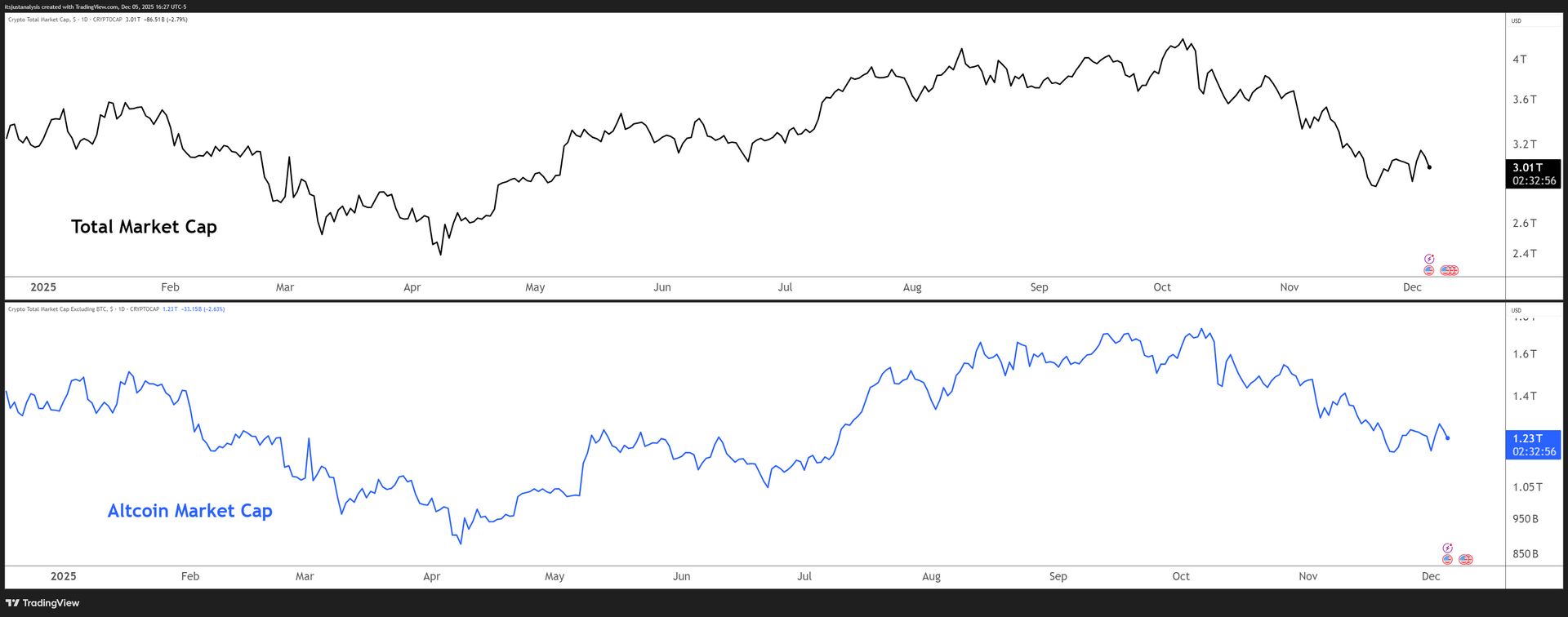 And here’s a look at crypto’s total market and altcoin market cap charts: