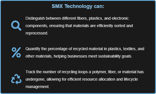 SMX embeds molecular markers in materials that survive recycling, reprocessing, and transformation. You can verify whether something is virgin or recycled plastic, track how many loops it’s been through, and authenticate composition at the molecular level.