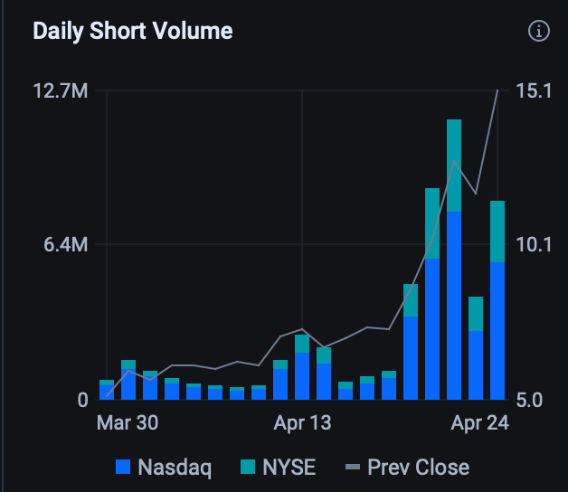 The short volume chart tells a story: Short volume for the stock was flat and tiny leading up to the interview and massive stock plunge. Mar 30 through ~Apr 13 saw short volume near 500k-1M shares. Then it starts creeping. Then Apr 20-24 it explodes — we’re talking 6M–12M+ shares shorted daily, right as the price ran from ~$5 to $15.10.