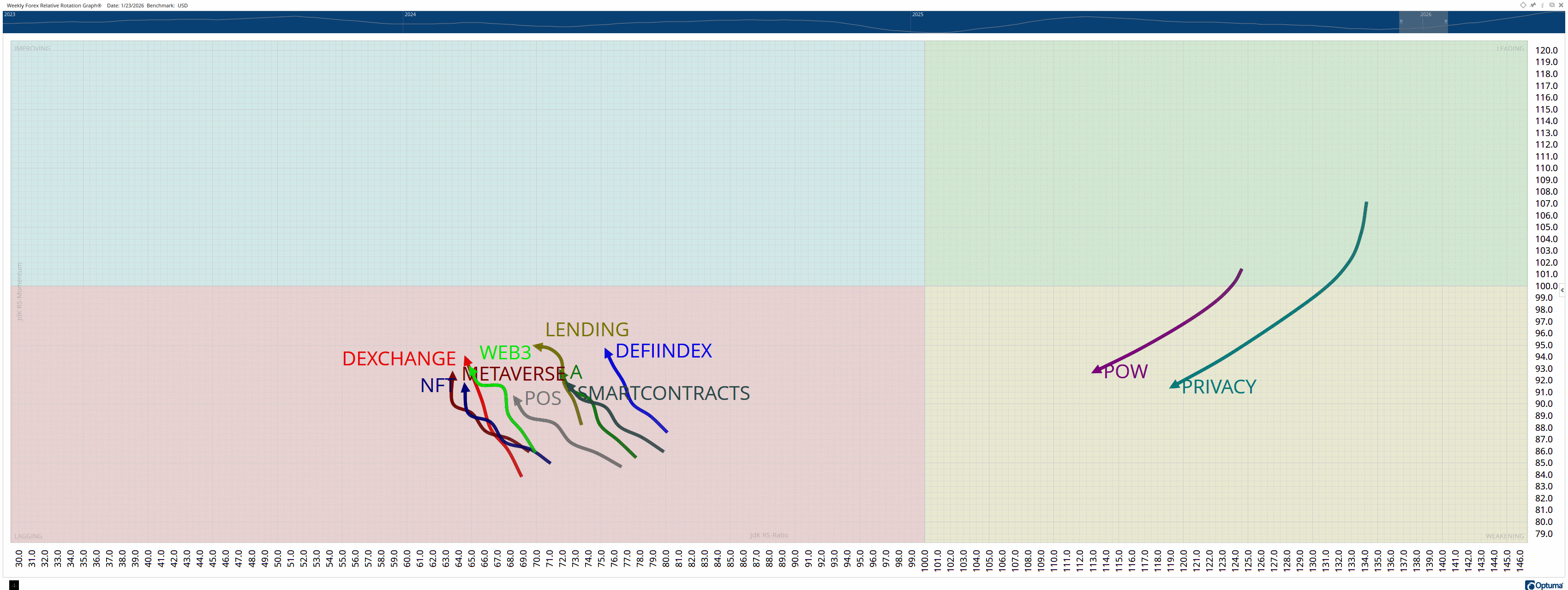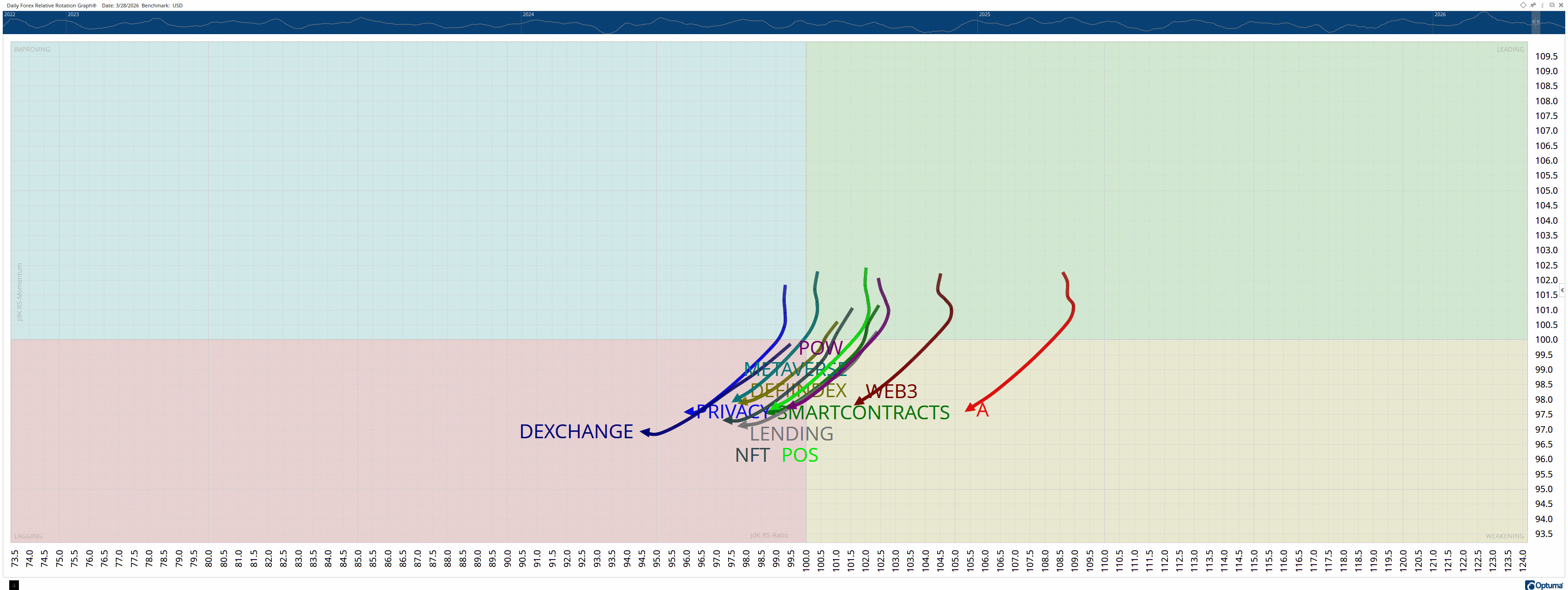 Relative Rotation Graphs (RRG) help us visualize how a currency or sector performs compared to a benchmark – in this case, the U.S. Dollar Index (DXY). Think of the four colored sectors as stages in a race: