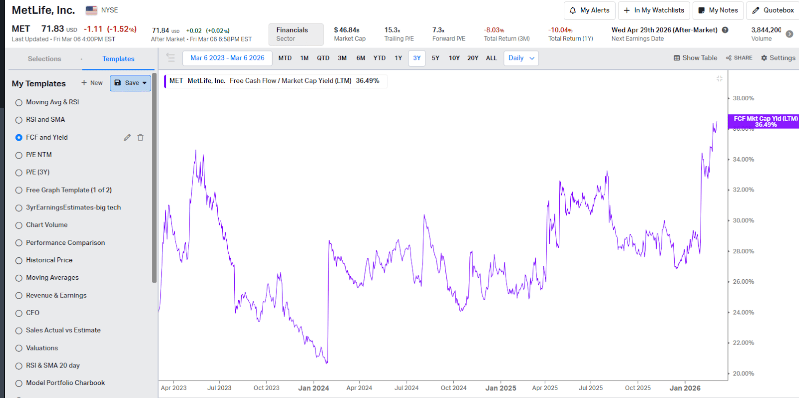 MetLife trades at a FCF yield of 36.5%, at highest levels of 3Y history, and leading peers.