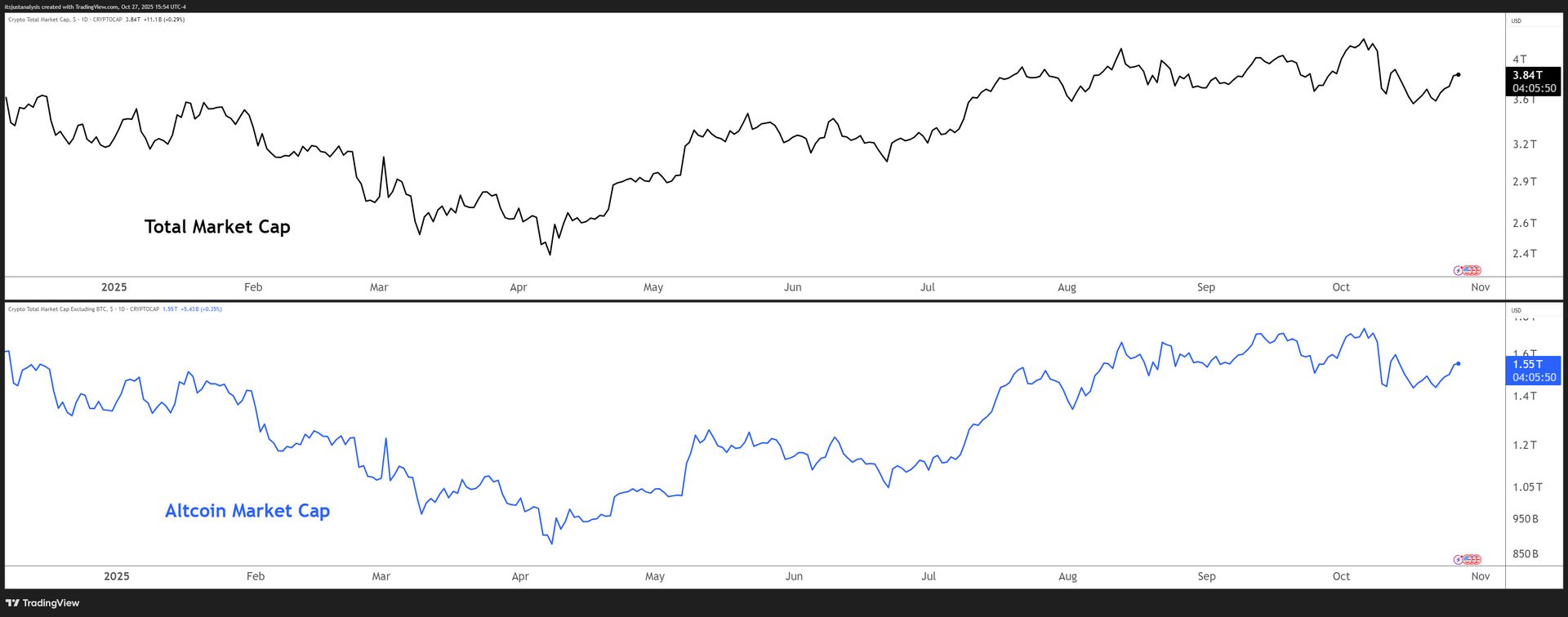 And here’s a look at crypto’s total market and altcoin market cap charts:
