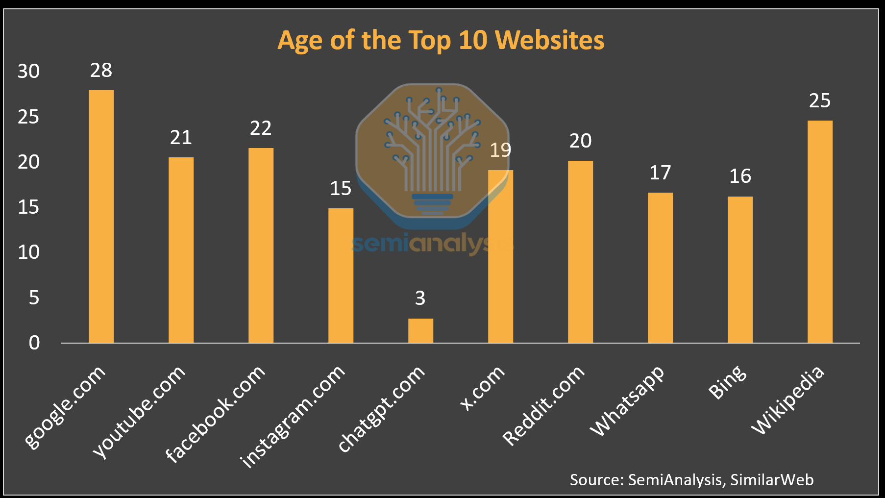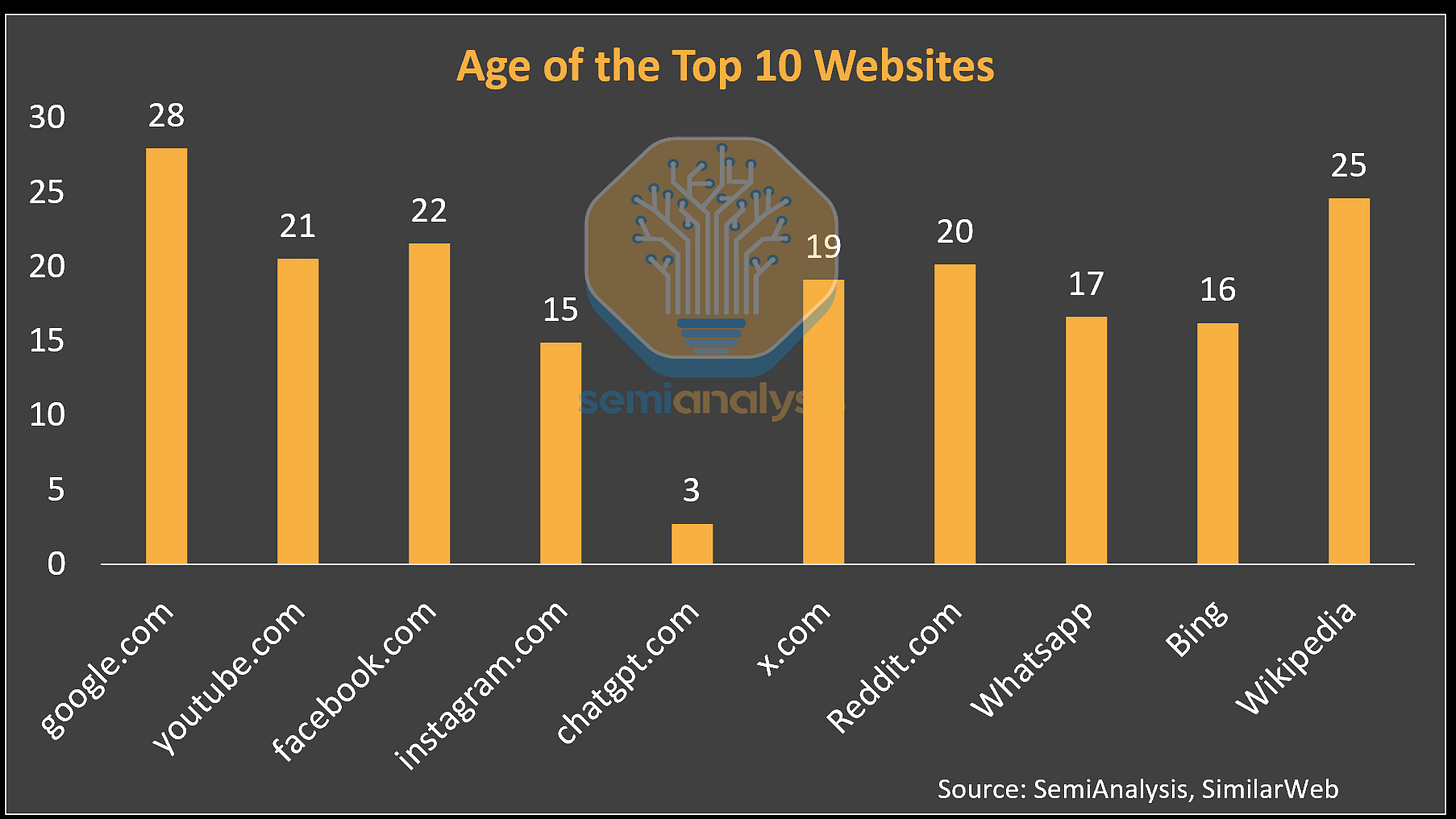 “Analysts focused on the model capabilities are missing the much larger context of network effects that ChatGPT is gaining quickly. In November of 2023, ChatGPT wasn’t even in the top 100 websites; now it is number 5. Larger than X/Twitter, Reddit, Whatsapp, Wikipedia, and quickly approaching Instagram, Facebook, Youtube and Google. On the top 10 list, every single property is much older than ChatGPT.com, and the sheer number of unmonetized users is staggering.”
