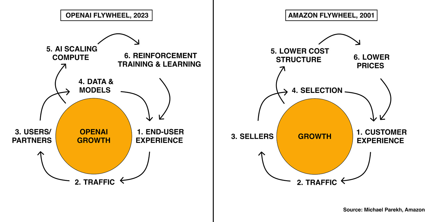But as I described it in 2023, OpenAI continues to need to accelerate ever faster around these loops. And grow AI Compute (step 5 below), as users and usage grow around the flywheel (steps 1-4 and 6) below. As compared to Amazon’s original flywheel from 25 years ago. That is what OpenAI CFO Sarah Friar is detailing above.