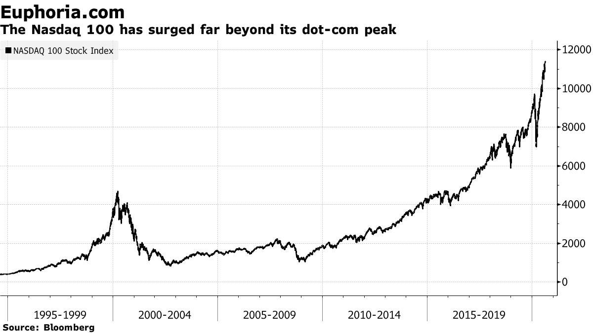 Good point. Everyone bring that up. But no on ever brings up the chart in the longer context of a decade or more later. Here’s a picture from over half a decade ago. Note the Nasdaq is at 20,650 today: