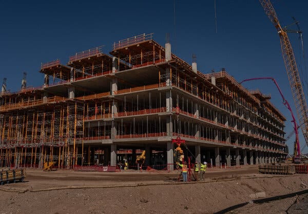 “A Taiwan Semiconductor Manufacturing Corporation facility under construction in Phoenix. As part of the trade deal, the company would commit to building more semiconductor facilities in Arizona.Credit.”