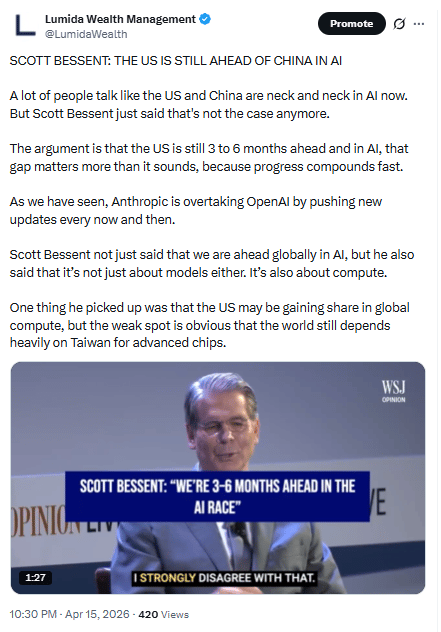 Bessent’s point is that the U.S. still holds a real lead in AI, and the bigger story is not just models, but the compute advantage underneath them.
