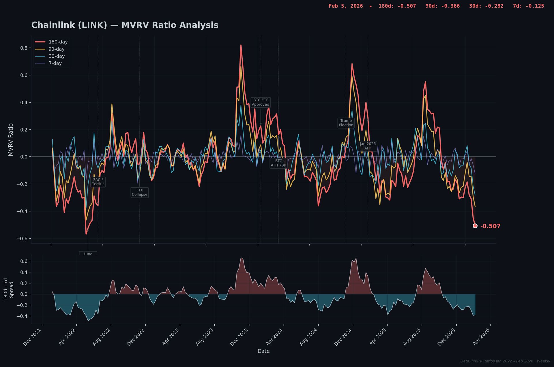 Then it spent two years giving every cent back and then some. The four-week collapse from -0.185 (Jan 8) to -0.507 (Feb 5) is the most violent deterioration in LINK’s history.