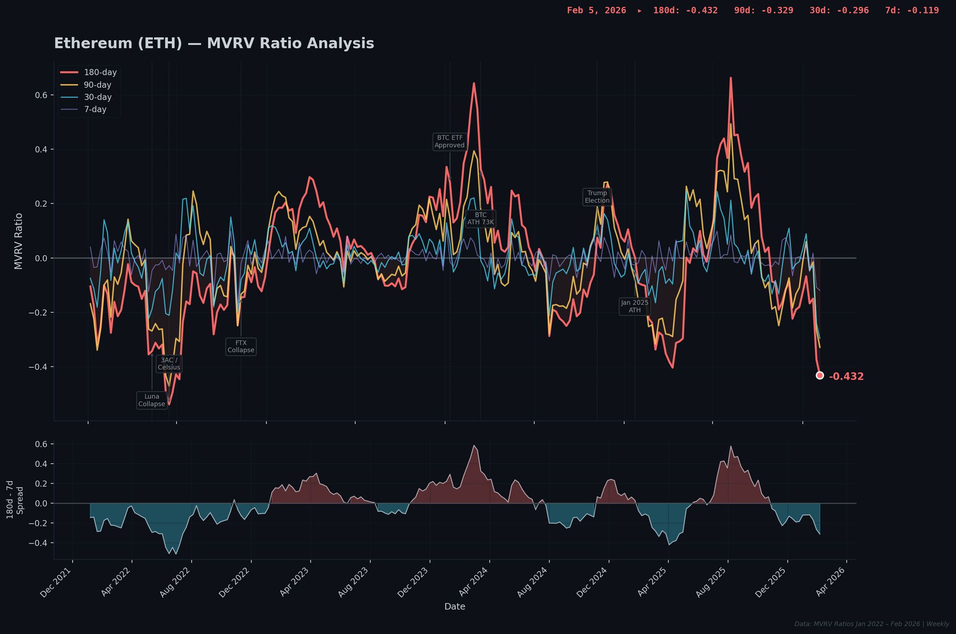 The current 180-day is worse than the Luna collapse (-0.343), worse than FTX (-0.145), and closing in on Three Arrows territory (-0.539 in June 2022). Five weeks into 2026 and ETH’s average 180-day MVRV (-0.220) is already worse than the entire 2022 bear market average (-0.190).