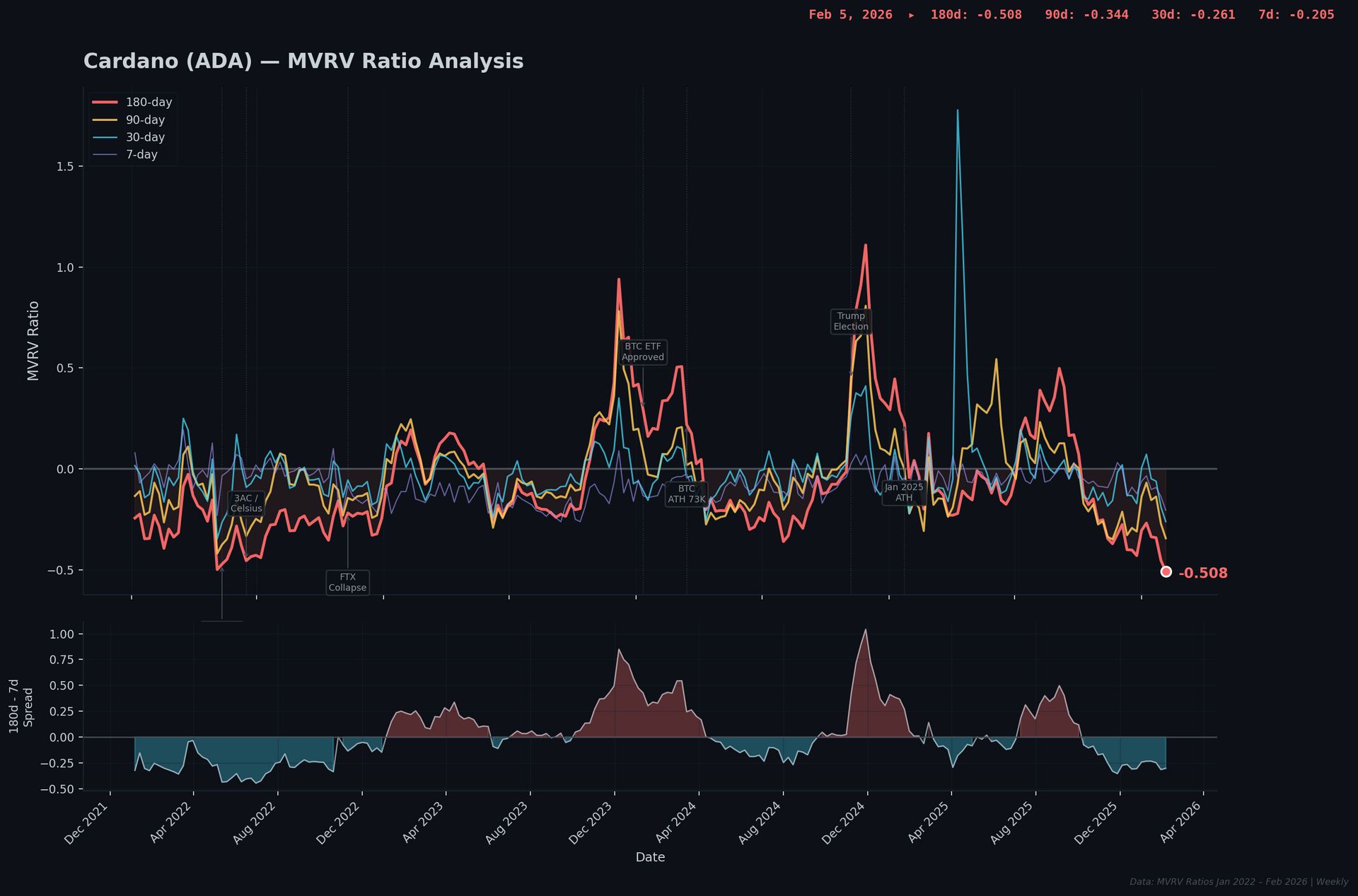 Congratulations to ADA for achieving something truly remarkable: its 180-day MVRV of -0.508 is the worst reading in the entire dataset – out all four tickers and on any timeframe. 😨