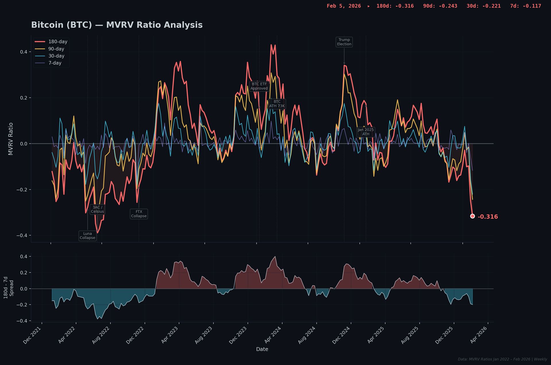 The 180-day at -0.507 trails only the May 2022 readings (-0.523 and -0.569) when the market was actively on fire. The 90-day and 30-day are both in the bottom 1.5th percentile – MVRV levels previously reserved exclusively for the most catastrophic events of the 2022 bear market.