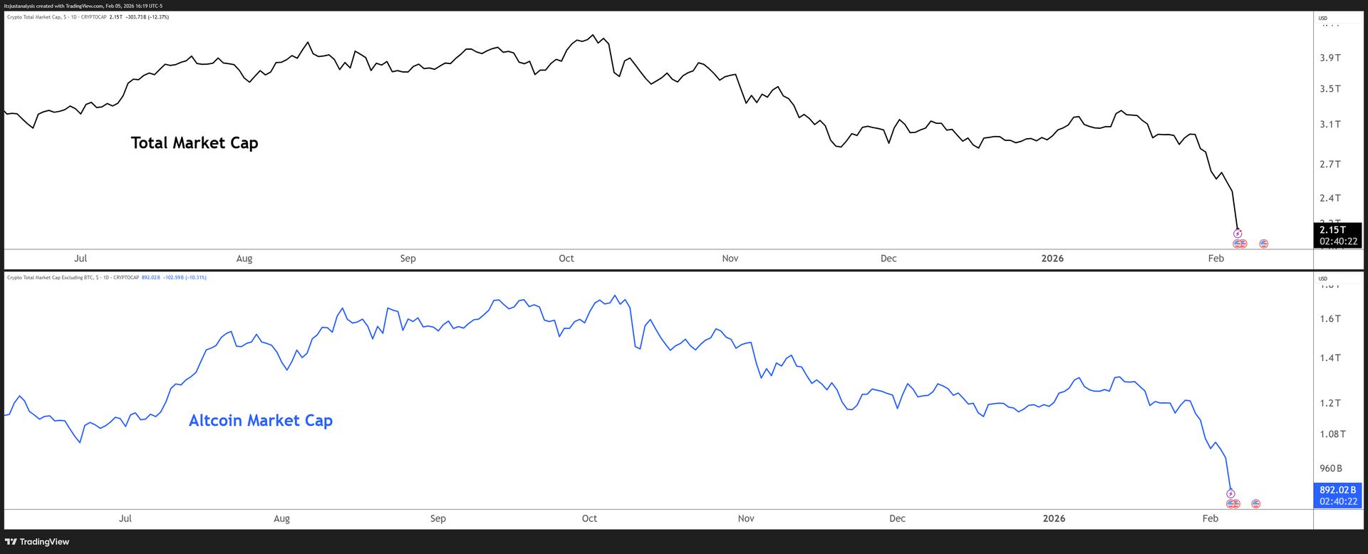 And here’s a look at crypto’s total market and altcoin market cap charts:
