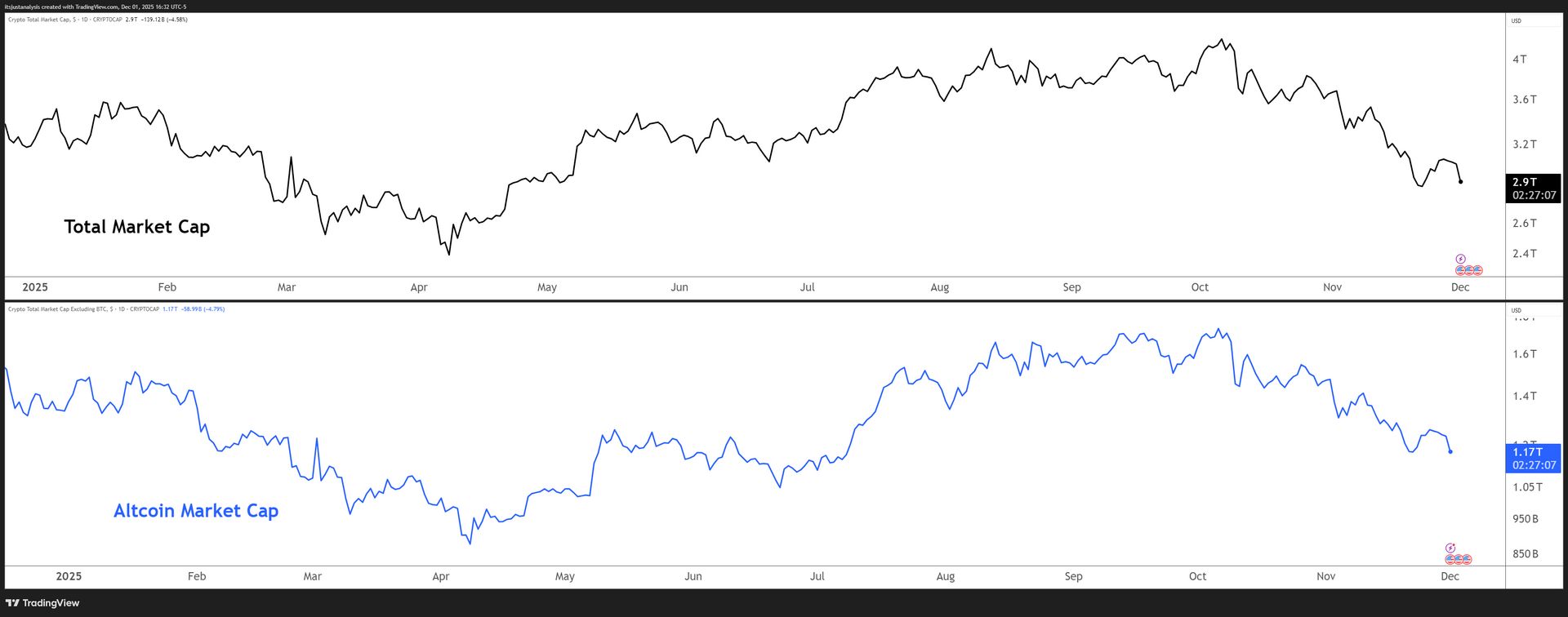 And here’s a look at crypto’s total market and altcoin market cap charts: