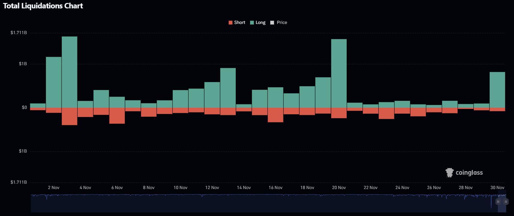 Long bias persistence: Only 4 days out of 30 saw shorts take more damage than longs (Nov 8, 22, 25, 28).