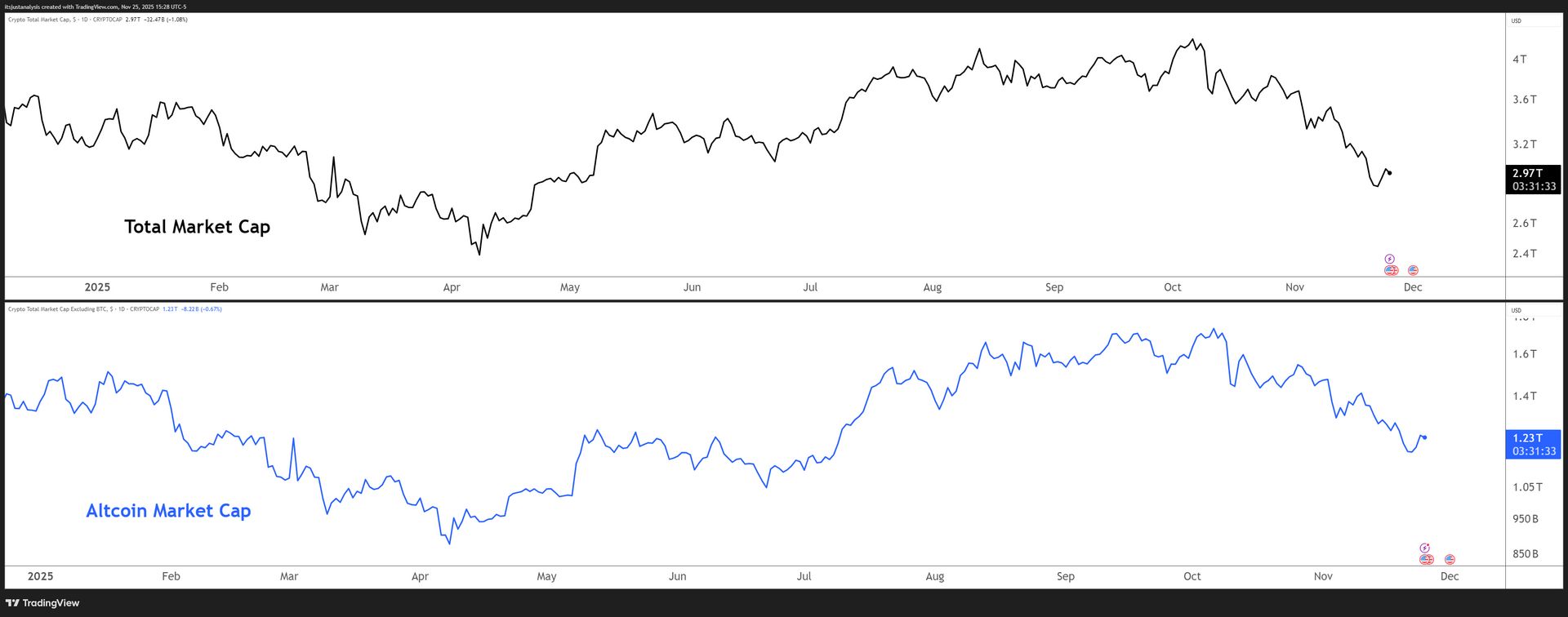 And here’s a look at crypto’s total market and altcoin market cap charts: