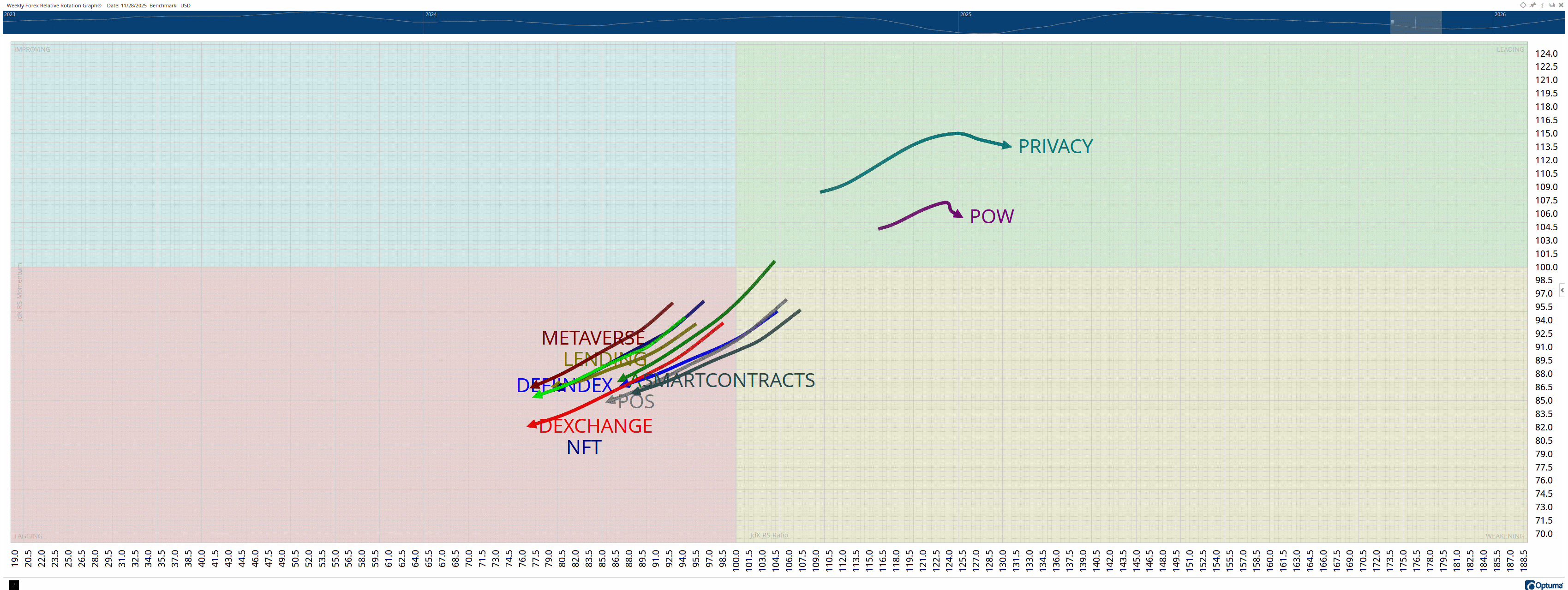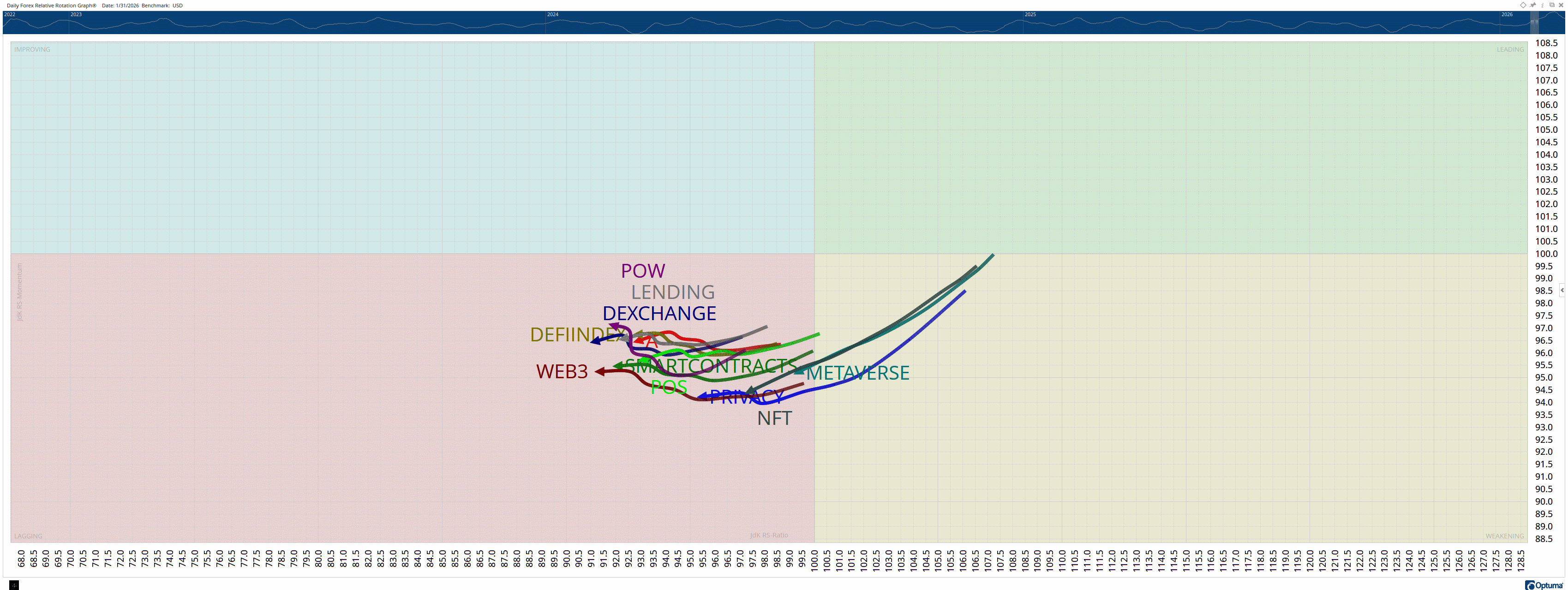 Relative Rotation Graphs (RRG) help us visualize how a currency or sector performs compared to a benchmark – in this case, the U.S. Dollar Index (DXY). Think of the four colored sectors as stages in a race: