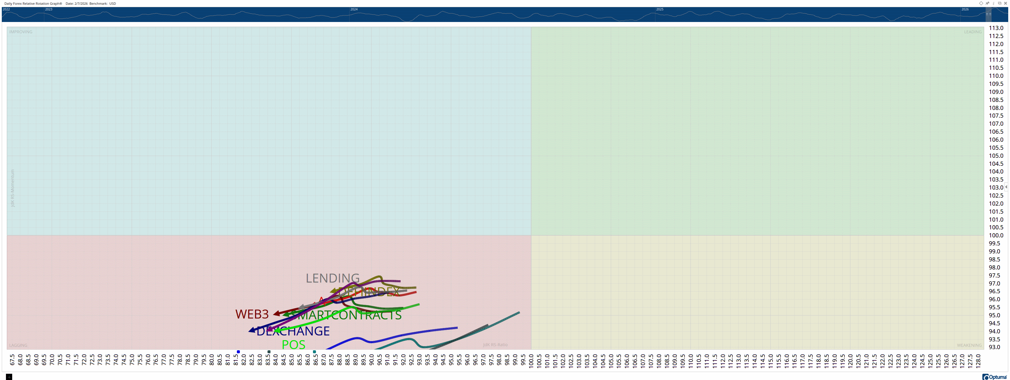 Relative Rotation Graphs (RRG) help us visualize how a currency or sector performs compared to a benchmark – in this case, the U.S. Dollar Index (DXY). Think of the four colored sectors as stages in a race: