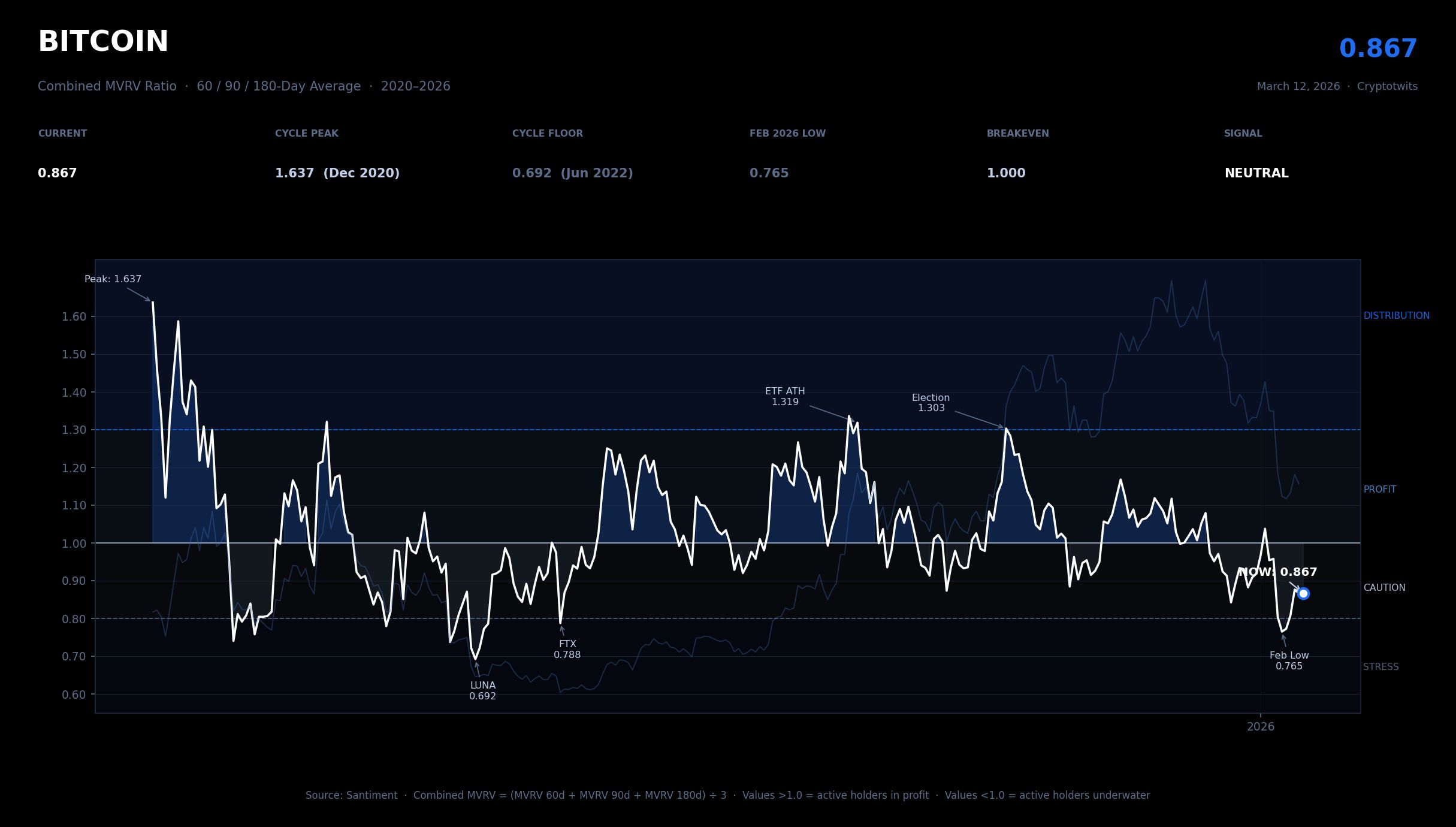 The composite bounced. It’s been parked in the 0.85-0.92 corridor for three weeks now. That’s historically a zone that goes one of two ways: base-building that eventually reclaims 1.0, or a dead-cat bounce before the next leg lower. The data alone can’t tell you which.