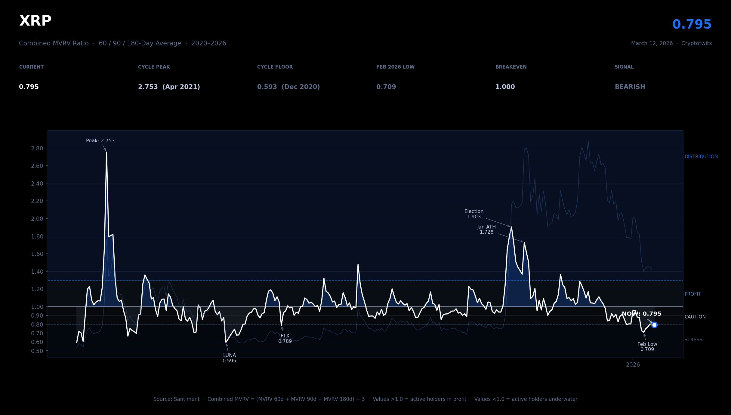 The post-election run was real. The composite hit 1.903 at $2.35 in late November and kept climbing into January, peaking at 1.728 at $3.16. That was the last time XRP’s active participants were mostly in the money.