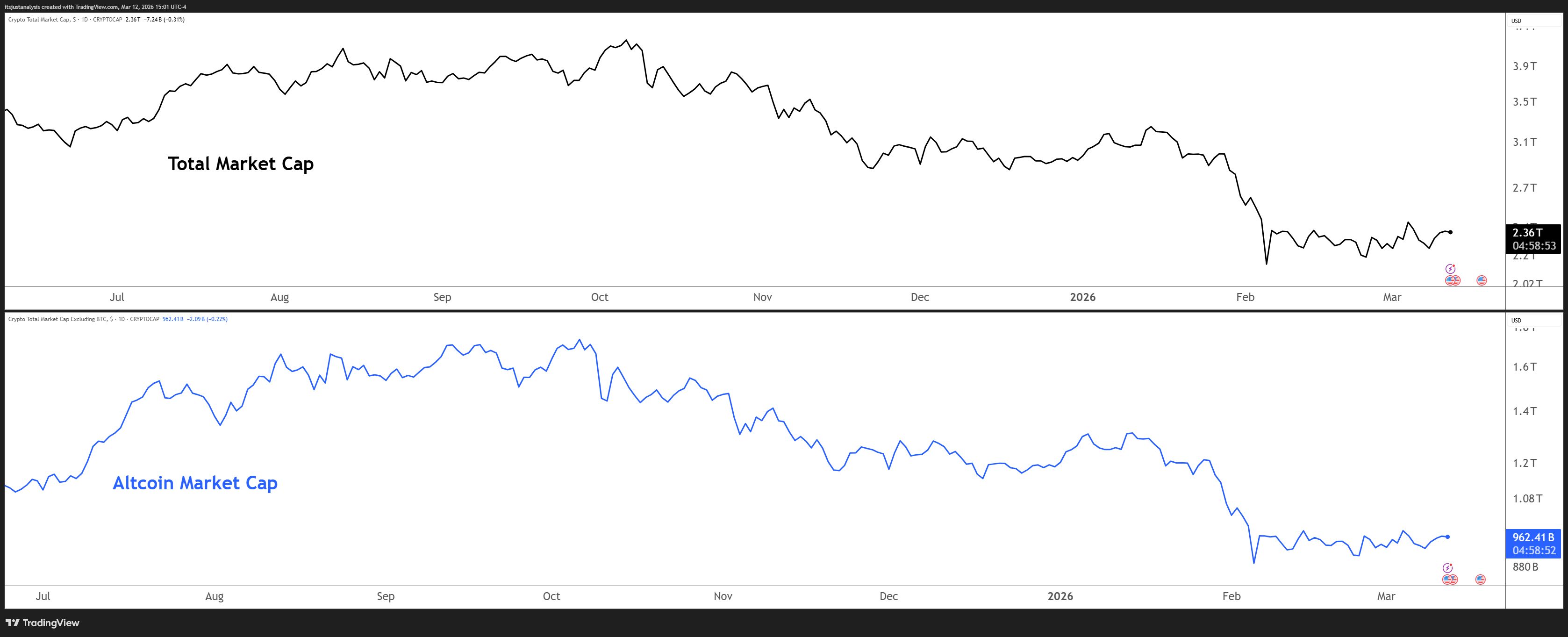 And here’s a look at crypto’s total market and altcoin market cap charts: