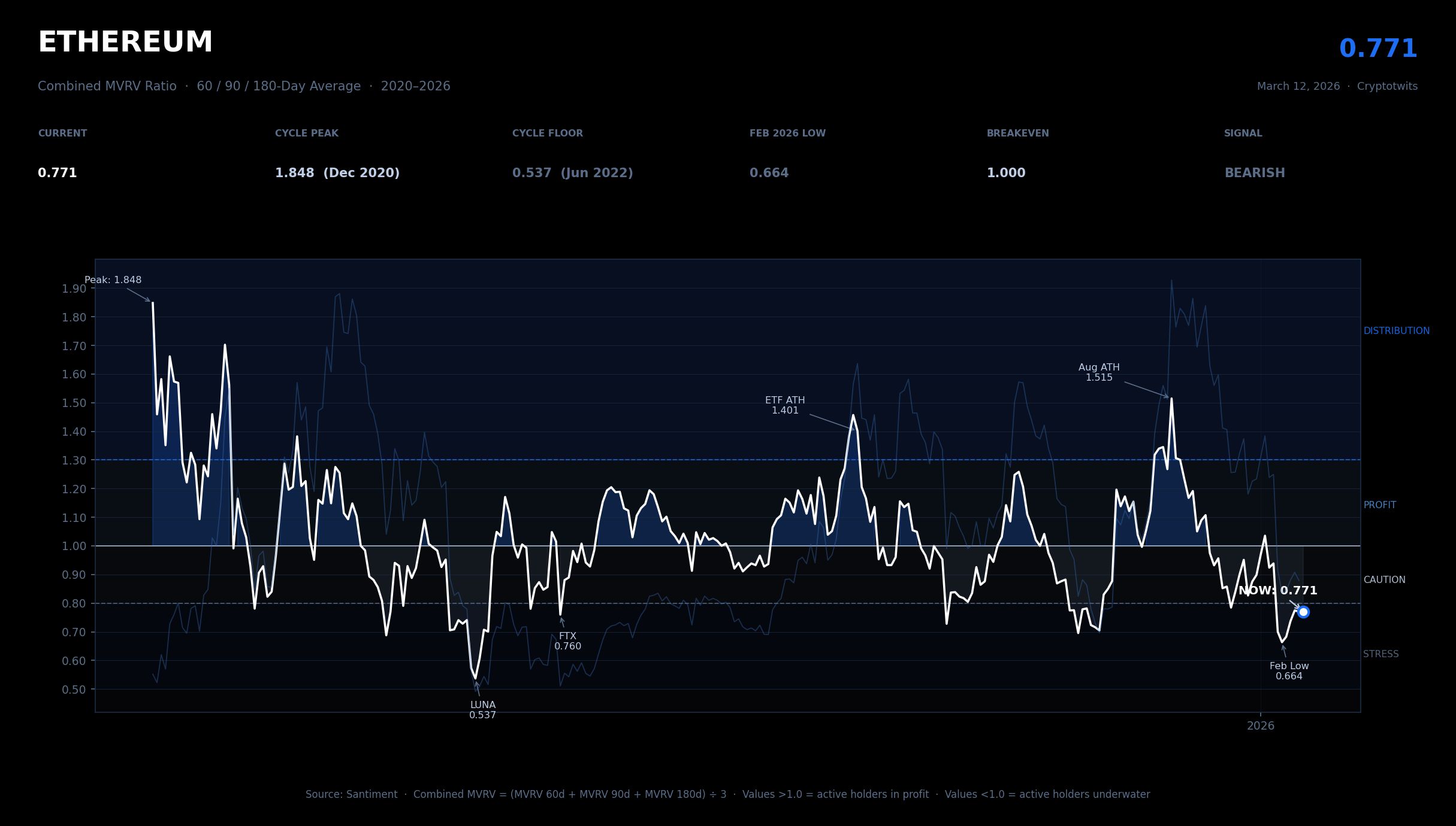 Thirty-three weeks in this dataset have printed sub-0.80. Sixteen of them are from 2025 and 2026. ETH has logged nearly half of its entire historical distress readings in the last fourteen months.