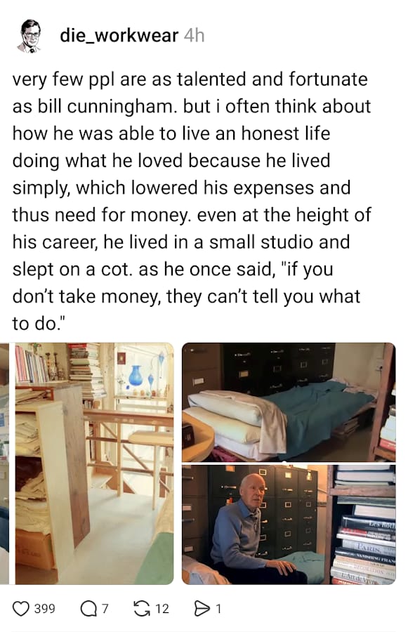 HOW MUCH DO YOU NEED: Wisdom from Bill Cunningham. “If you don’t take money, they can’t tell you what to do.”