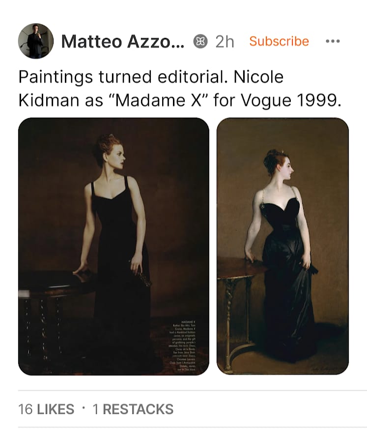 PAINTINGS: Love this Nicole Kidman does Madame X. The painting is one of my favorites and I visit it often in the Met.