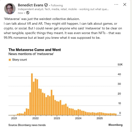 THE METAVERSE: Timely reminder from Benedict Evans that we can all be talking about something like the Metaverse and it can disappear just as quickly as it appeared.