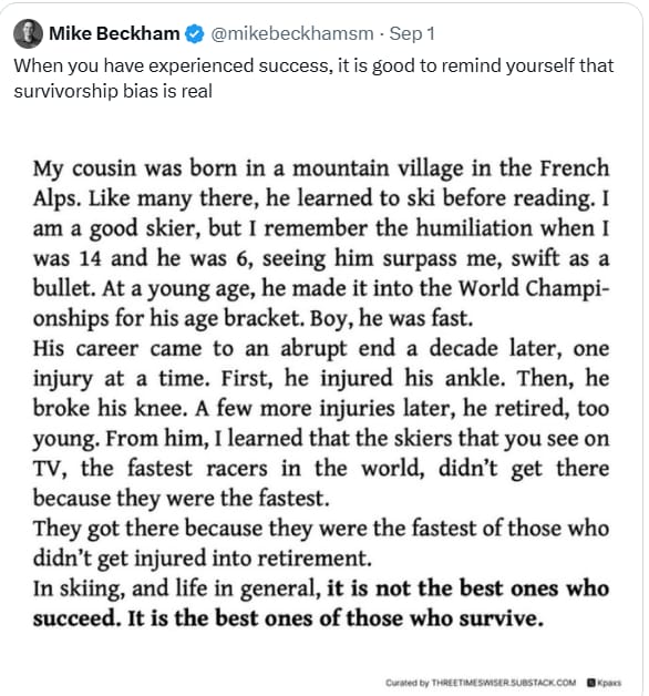 SURVIVORSHIP BIAS: I think about this all the time. We look at winners and derive what it took to win and assume that that is what it takes. But those conclusions are likely skewed by survivorship bias.