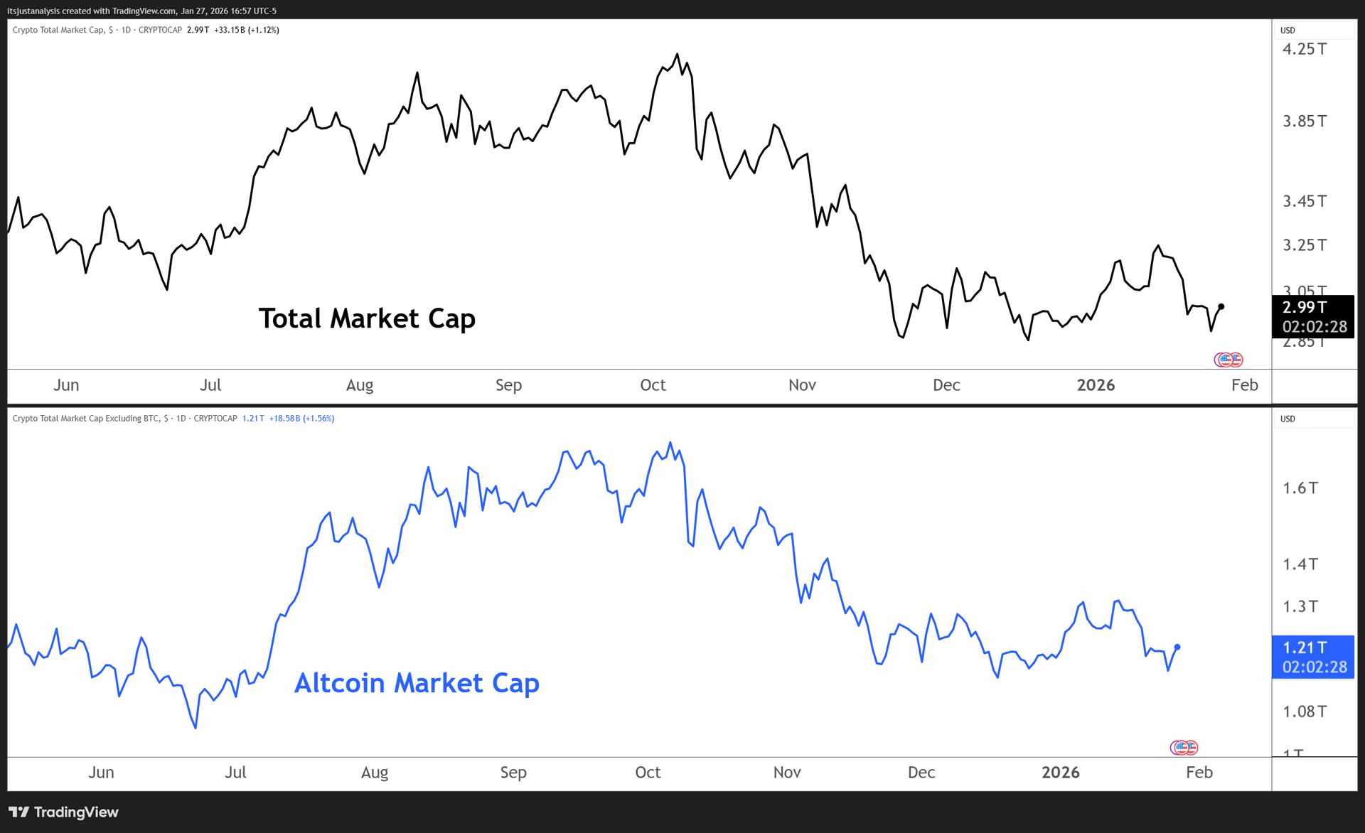 And here’s a look at crypto’s total market and altcoin market cap charts: