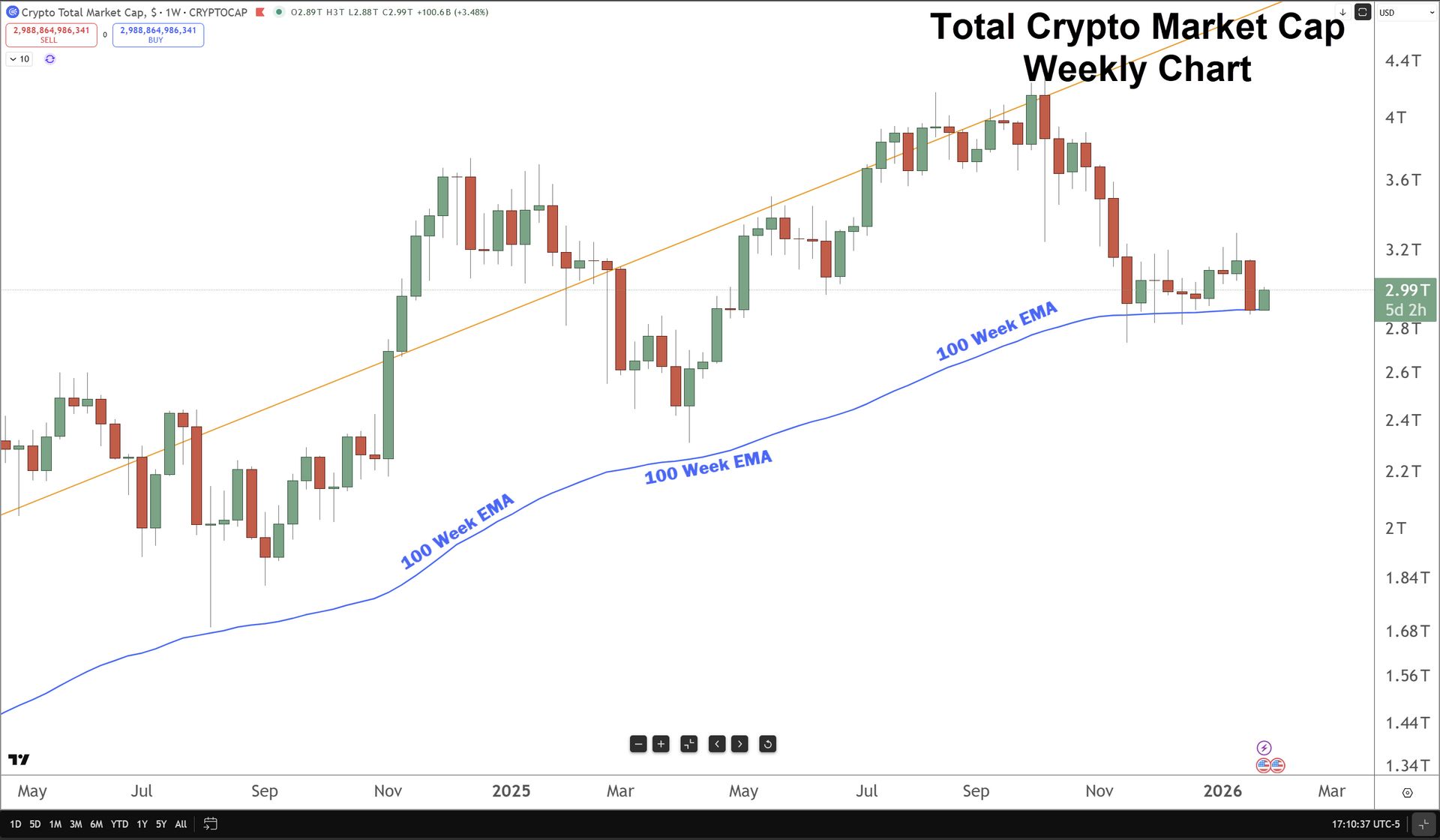 The chart below is the weekly Total Market Cap weekly chart. And that blue moving average is the 100 Week Moving Average. I guess I also wrote it on there. Three times. Anyway. 😶