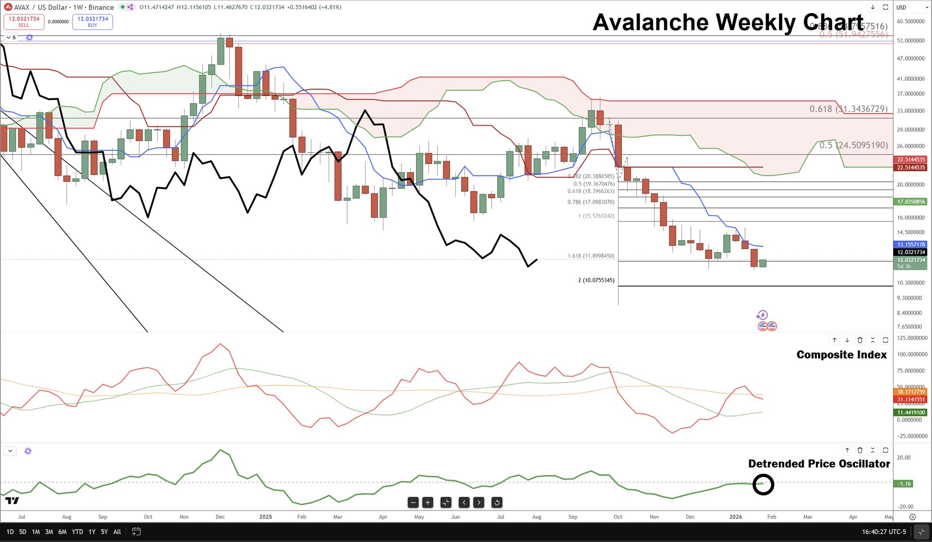 It looks horrible, but there’s a possibility that the pain might be ending. If the weekly can close above the 161.8% Fibonacci extension ($11.86) and if the Detrended Price Oscillator crosses and closes above the zero line, then AVAX could get a strong relief rally. 👍️