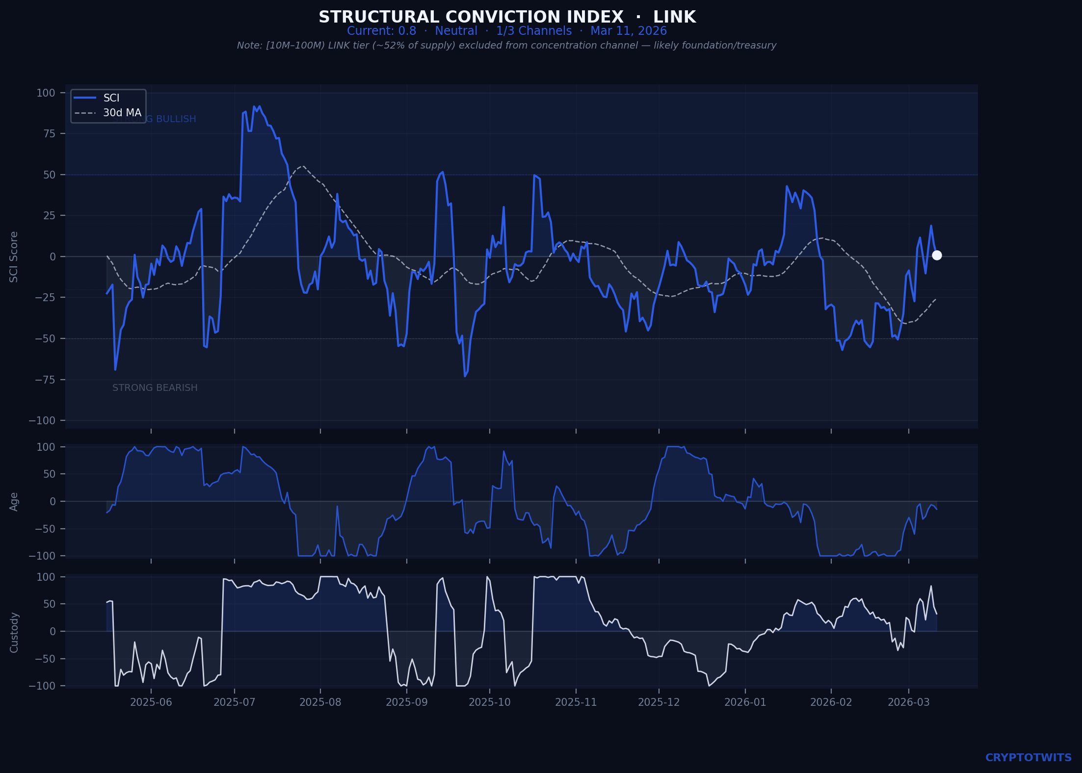 One more thing worth flagging: the [10M–100M) LINK tier holds nearly 40% of total supply and is excluded from the concentration channel entirely – it’s almost certainly Chainlink foundation and treasury wallets, not market participants. Keep that in mind when interpreting any LINK structural data, SCI or otherwise.