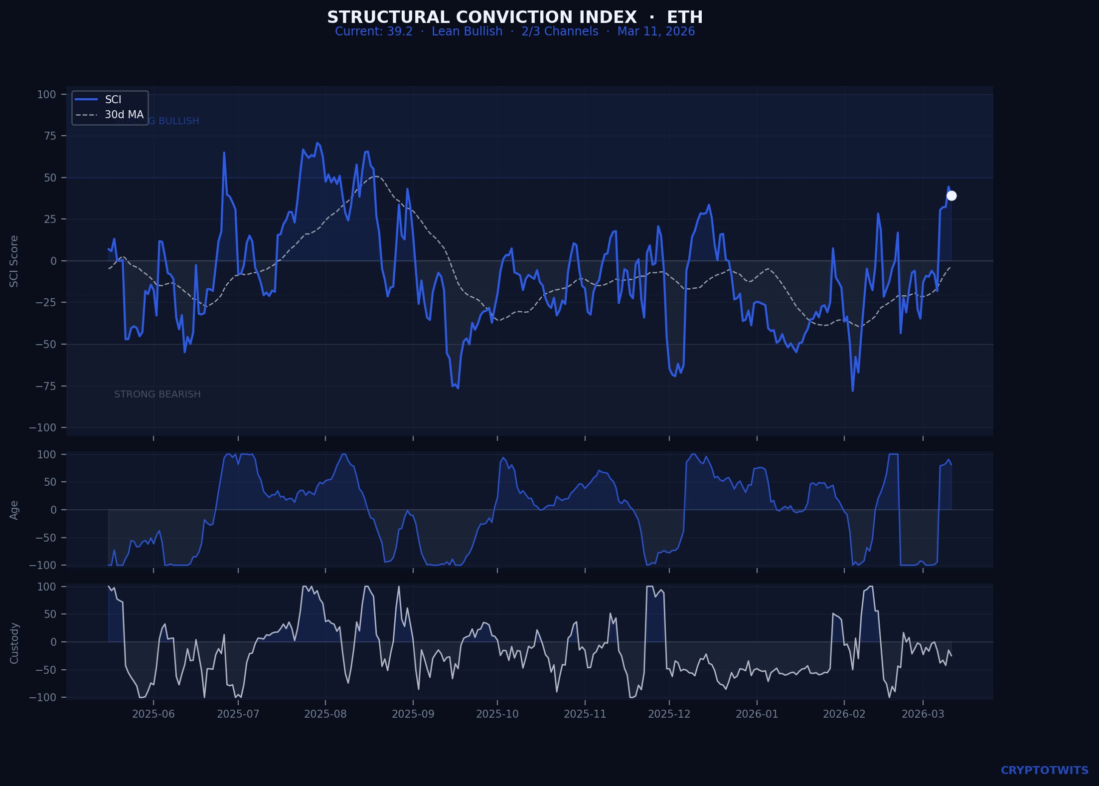 Lean: cautiously neutral. What changes it – Concentration Migration crossing back above zero with the age signal intact pushes the composite above +30 and makes this a different conversation. Until then, don’t confuse a bounce from the floor with a new foundation. 💯