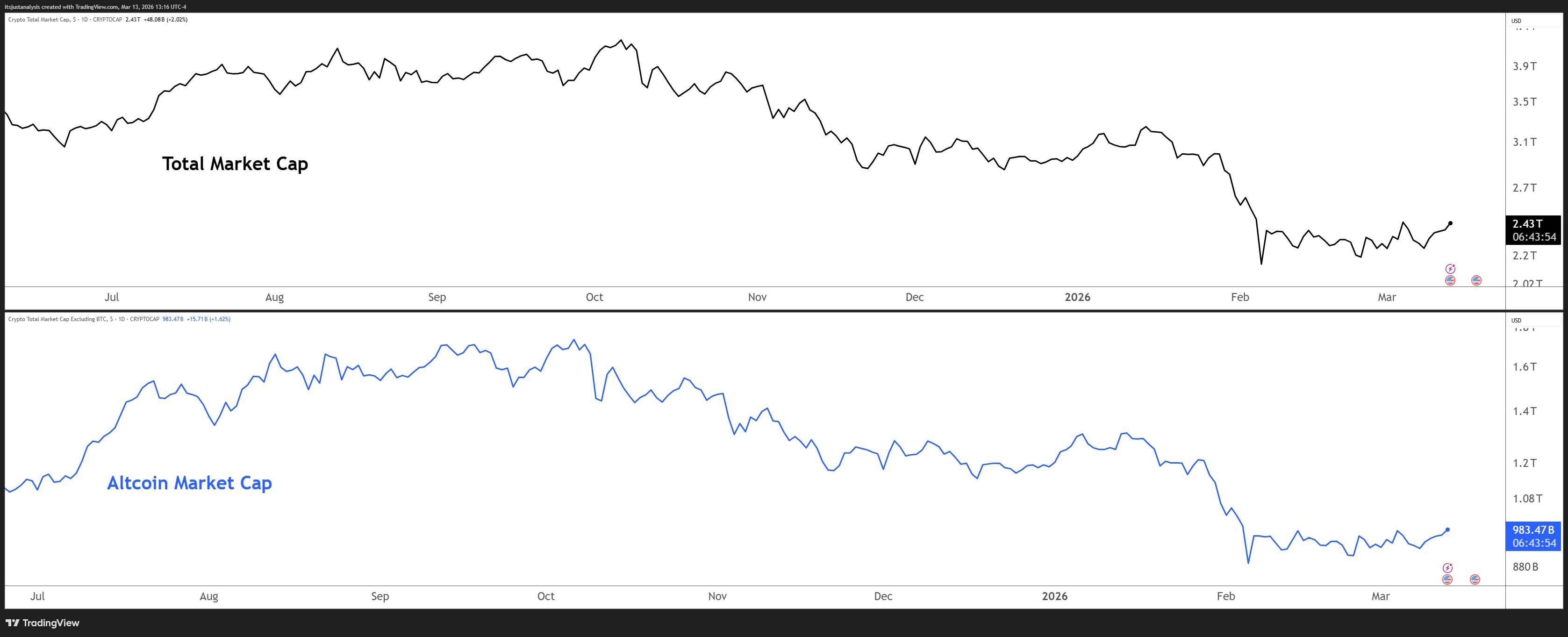 And here’s a look at crypto’s total market and altcoin market cap charts: