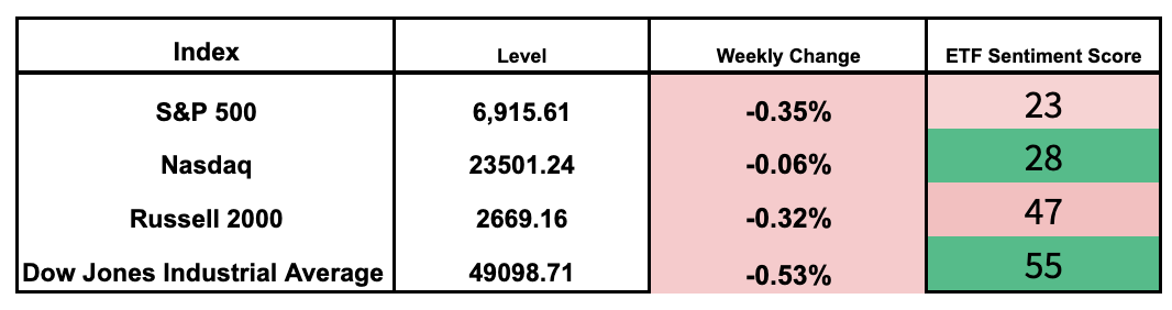 Major stock indices finished mixed in a volatile, short week as investors grappled with a “Greenland-induced” trade war scare and a significant plunge in Intel shares. While markets initially tumbled after President Trump threatened fresh 10% tariffs on eight European allies to pressure a sale of Greenland, equities recovered mid-week when he signaled a de-escalation at Davos. However, the week ended on a cautious note with the S&P 500 suffering its second straight weekly loss, as gold surged toward $5,000 and silver topped $100 amid persistent geopolitical uncertainty and Intel’s 17% post-earnings slide.