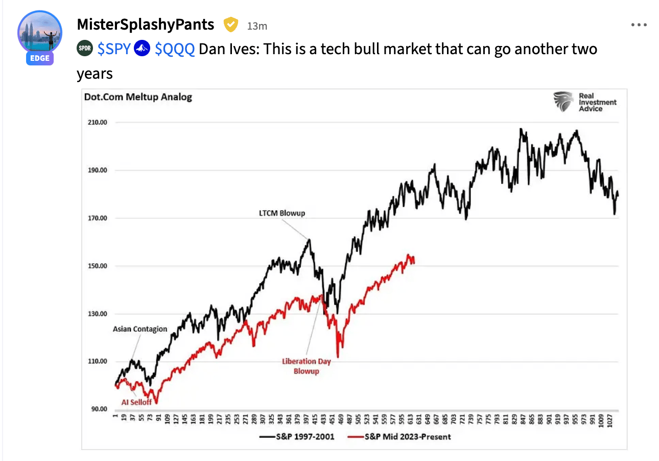 Dot-Com Analog Flags Meltup Risk As 2023–25 Tech Surge Mirrors 1997–2000 Blowoff Pattern, AI Selloff Might Loom 📊